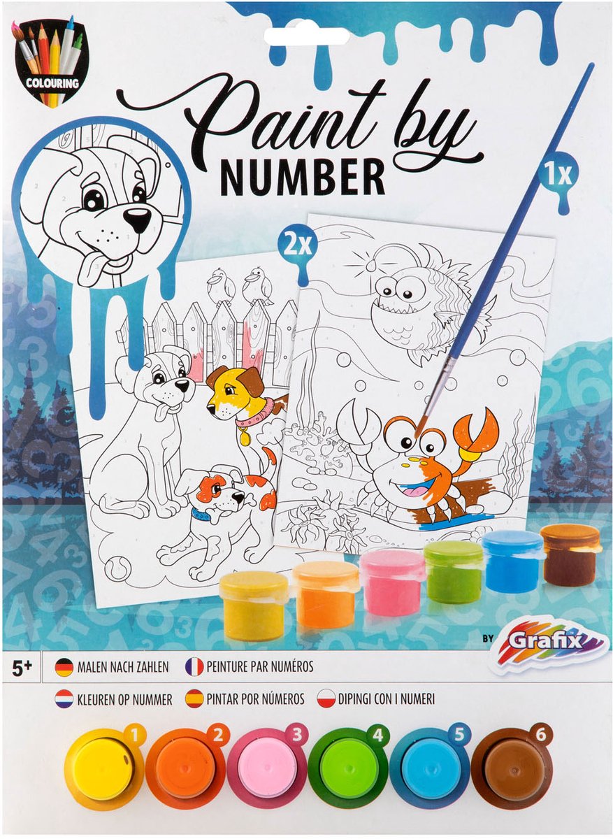 Schilderen op nummer dieren met 2 plaatjes. Inclusief verf en penseel.
